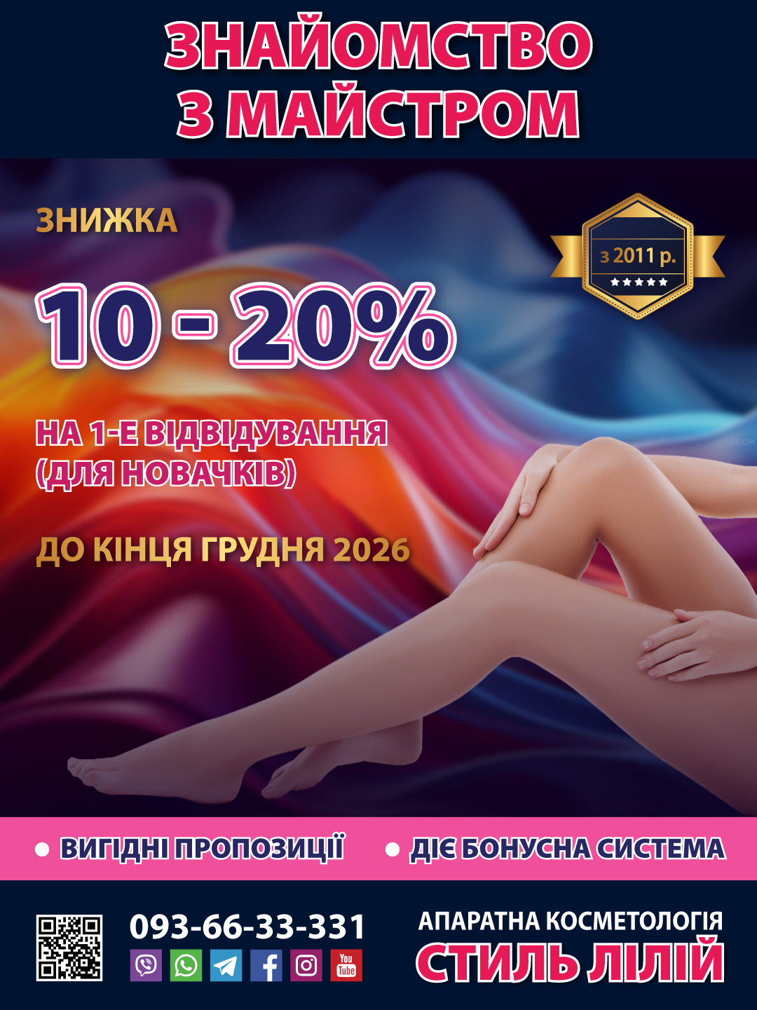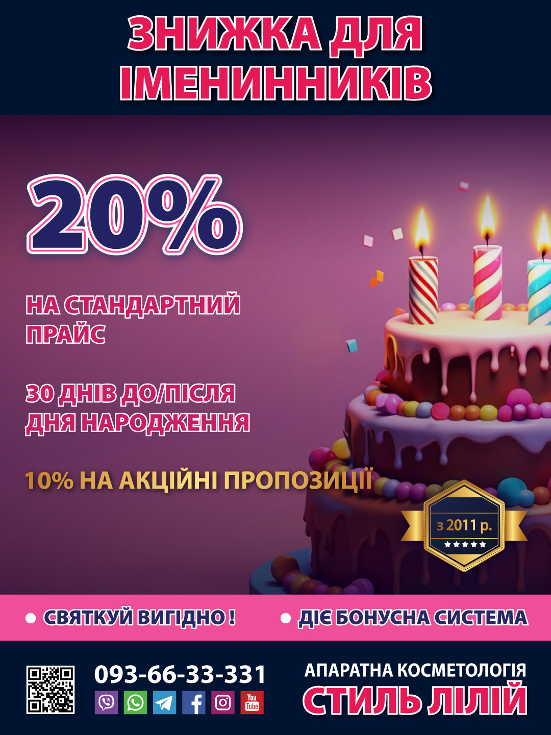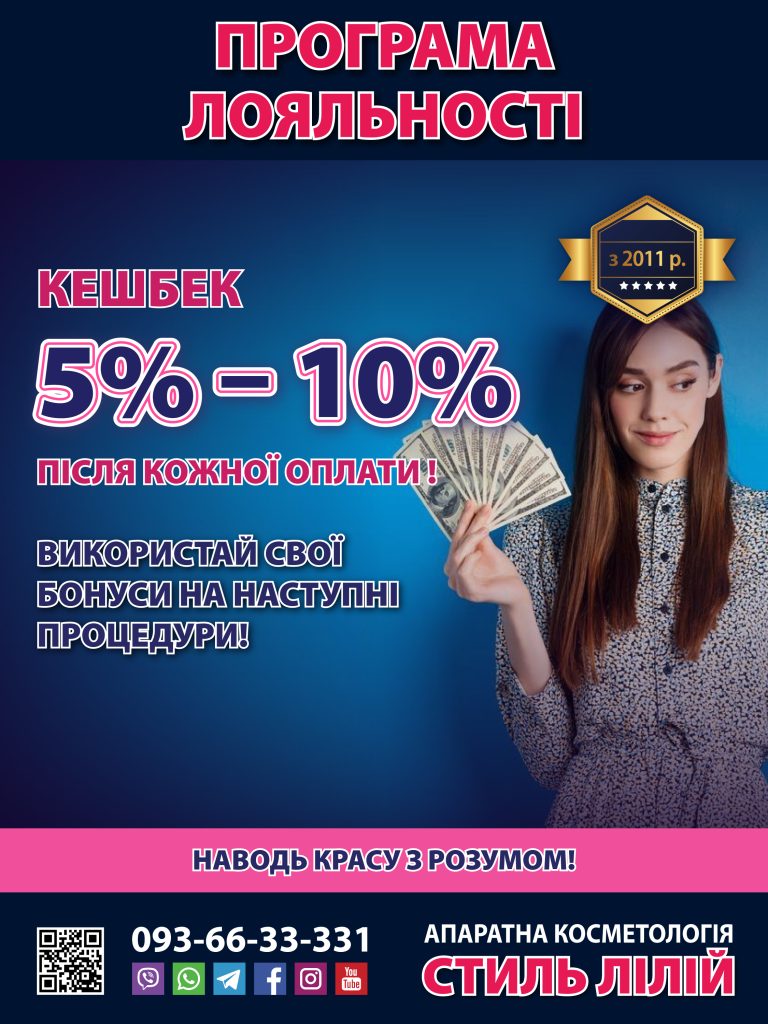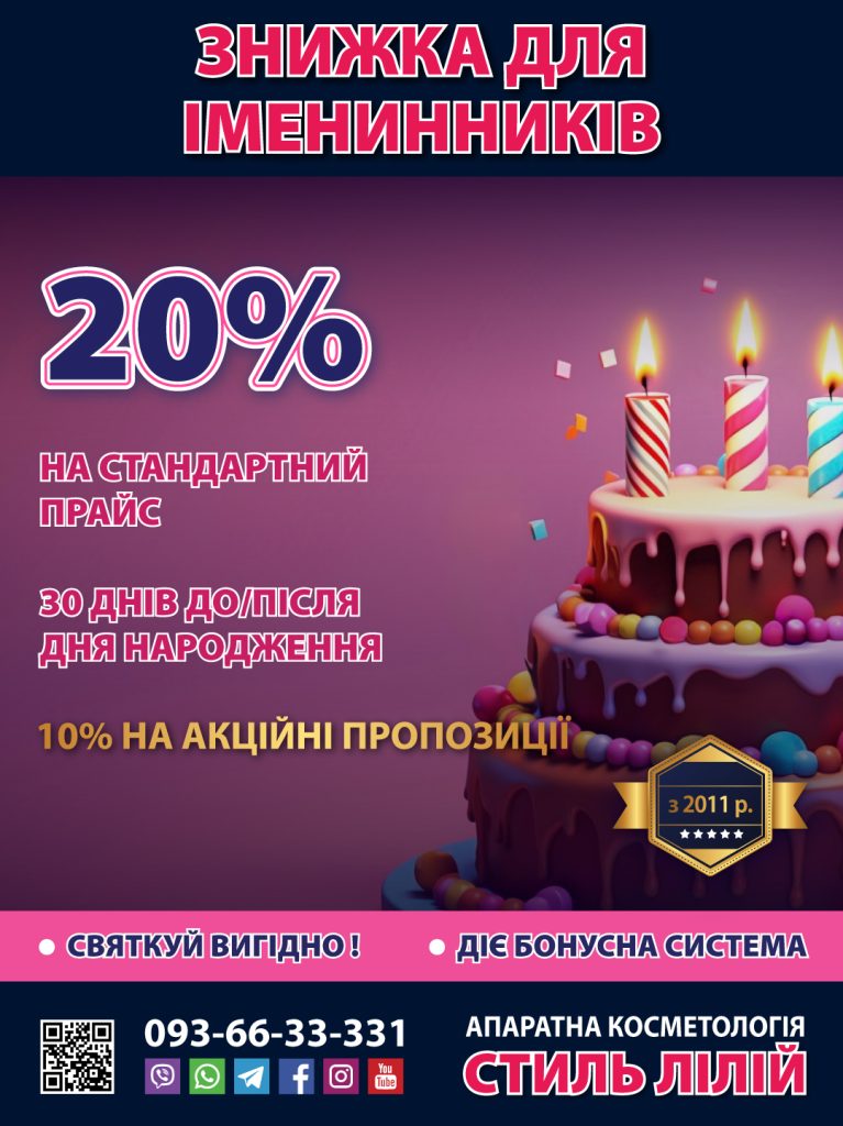 Протягом 30 днів до або після Вашого Дня народження отримайте у подарунок разову знижку 20% на будь-яку нашу процедуру по стандартному прайсу.